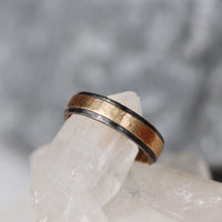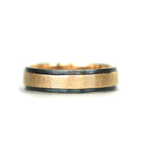The rustic hammered texture flat band with contrasting black rhodium plated edges. 100% 14K recycled gold, 5mm wide.