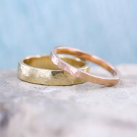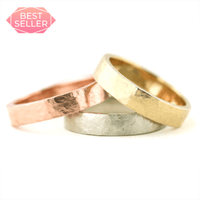 The rustic hammered texture flat band in 100% 14K recycled gold works great in a stack or as a wedding band. 4mm wide