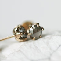 4mm salt and pepper diamonds studs, contemporary and badass. They are held with pointy claws and have subtle leaf detailing on the side.