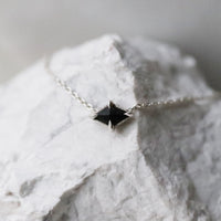Kite shaped rose cut black spinel (10mm X 7.5mm) pendant on 18" long chain, great for everyday wear.